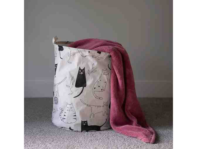 Round storage basket with handles. Measures 15 inches round x 18 inches tall. Folds flat for storing. Constructed of light weight fabric that is 30 percent cotton/70 percent polyester. Laminated interior and wire rimmed top make it sturdy and helps keep its shape.