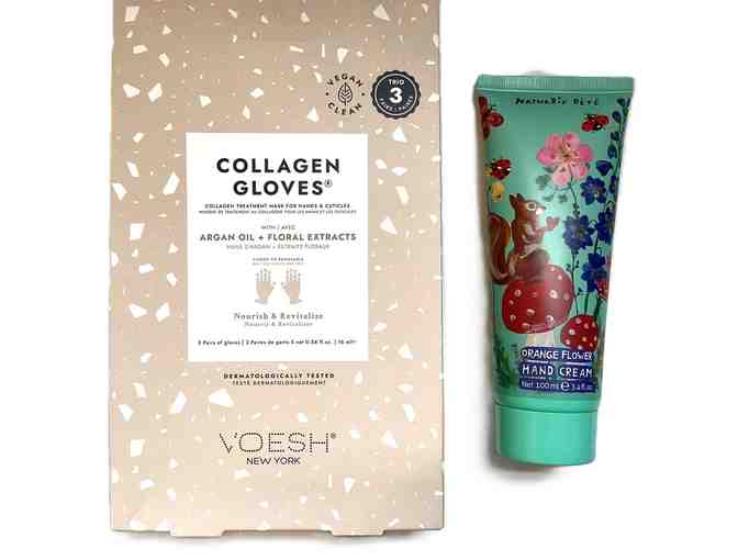 Intensive collagen treatment mask for hands and cuticles. Infused with vegan collagen, argan oil and flower extracts. The perfect remedy for dry, over-worked hands. Get a manicure in a glove. Set of three pairs. 3.4 ounce Forest Folk hand cream. Discover the magical world of artist Nathalie Lette. Fragranced with zesty bergamot, orange blossom and jasmine on creamy sandalwood and elegant musk. Formulated with cornflower, black truffle and Reishi mushroom extracts plus vitamin E for soft feeling hands.