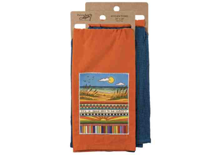 A set of two coordinating cotton kitchen towels. Towel one features a stitched art panel with "It's A Good Day To Be Happy" sentiment and colorful wood burned designs on an orange base. Towel two features a blue waffle weave design. Our It's A Good Day To Be Happy towel set is machine-washable.