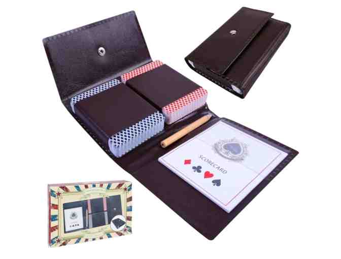 Leather Case includes 2 Decks of Standard Playing Cards, Pencil and Scorecard Notepad.