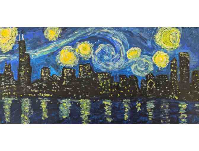 Bring the magic of the Windy City to your home with one of two 12" x 24" acrylic on canvas masterpiece, lovingly created by our talented NCA first grade students in Mr. Ortiz's classroom. Inspired by Van Gogh’s "Starry Night," this artwork reimagines Chicago’s iconic skyline under a swirling, starry sky.
