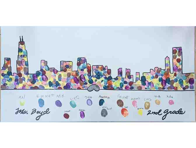 Celebrate the beauty of Chicago and the creativity of our NCA Second Grade students with this incredible 12" x 24" acrylic on canvas artwork! This masterpiece features a vibrant depiction of the Chicago skyline, brought to life in a pointillism style using colorful fingerprint dots.