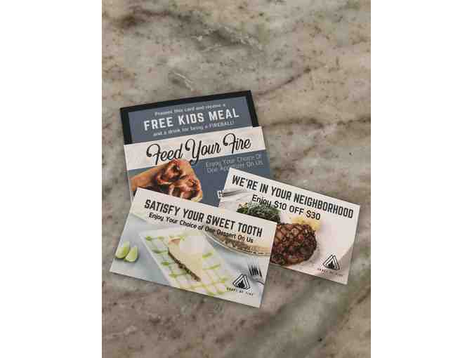 One free kids mean and beverage, $10 off $30, one appetizer and one choice dessert.