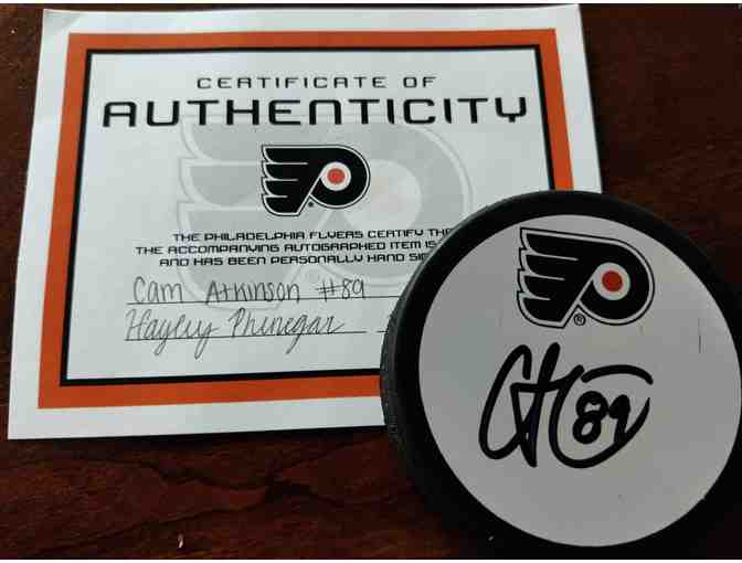 Calling all hockey fans! Take home a piece of the action with this fabulous collector's item. A genuine hockey puck signed by #89 Cam Atkinson himself. Signed puck is accompanied by a Certificate of Authenticity.