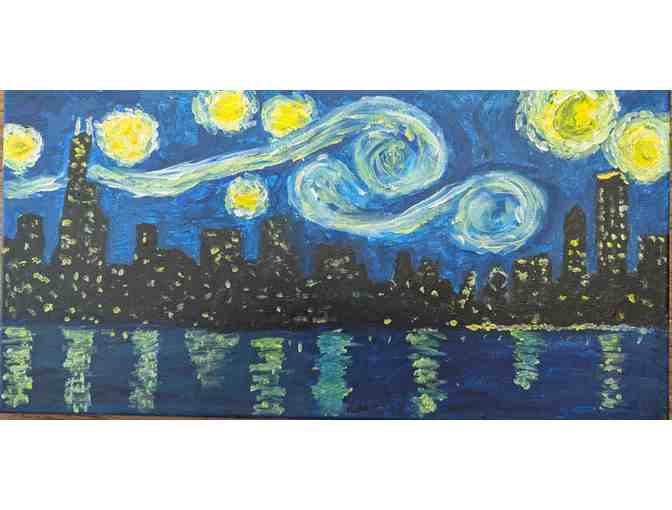 Bring the magic of the Windy City to your home with one of two 12" x 24" acrylic on canvas masterpiece, lovingly created by our talented NCA first grade students in Ms. Flesch's classroom. Inspired by Van Gogh’s "Starry Night," this artwork reimagines Chicago’s iconic skyline under a swirling, starry sky.