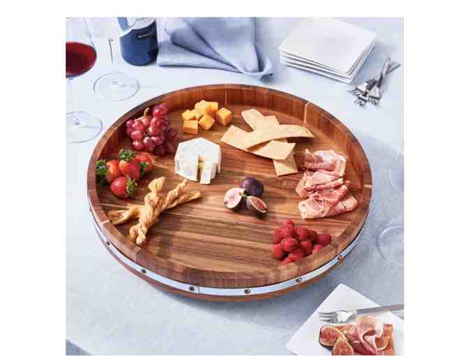 Wine Enthusiast 18” Lazy Susan Cheese Board with divider. Made from solid acacia and decorative iron hoop. Hand wash only.
