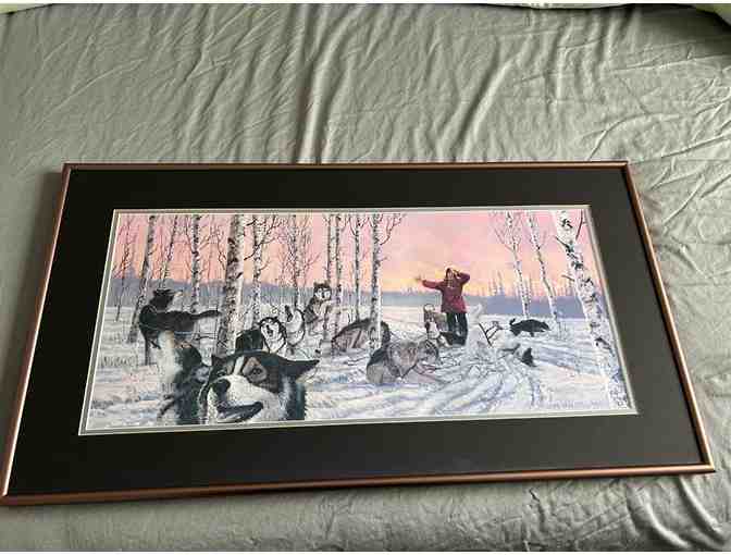 1997 Framed/matted print by John Van Zyle of musher with sled dogs. Signed on front.