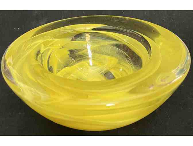 Gorgeous glass votive/tealight holder featuring dramatic yellow swirls inside -- handblown in Sweden, heavy.