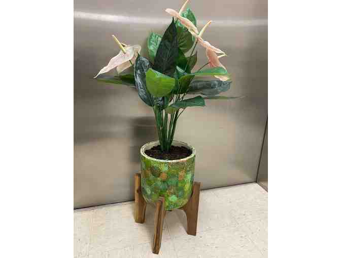 The circular ceramic planter measures 8.5 inches in diameter and 15.4 inches tall including the base. Including the artificial plant, it measures about 32 inches.