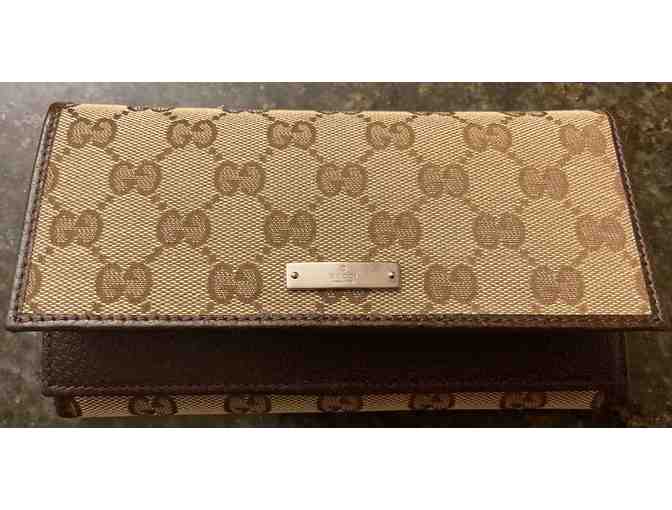 Made of leather and the designer brown branded Gucci fabric made wallet