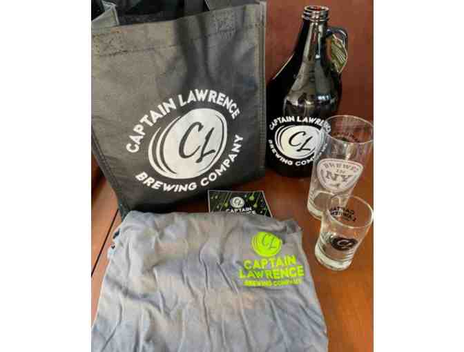 Enjoy a gift bag from Captain Lawrence Brewing Company which includes a growler bag, 64oz growler with free fill card, pint glass, sample glass, sticker, and t-shirt.
