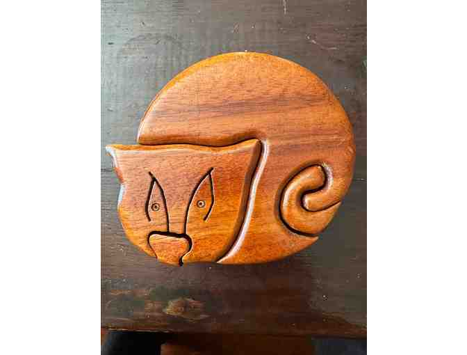 This adorable handcrafted Kitty Box (or is it a puzzle!) measures 5.5" x 4.5" x 2.5" high and is carved from Indian Rosewood. What a great gift for a kitty-loving friend!
