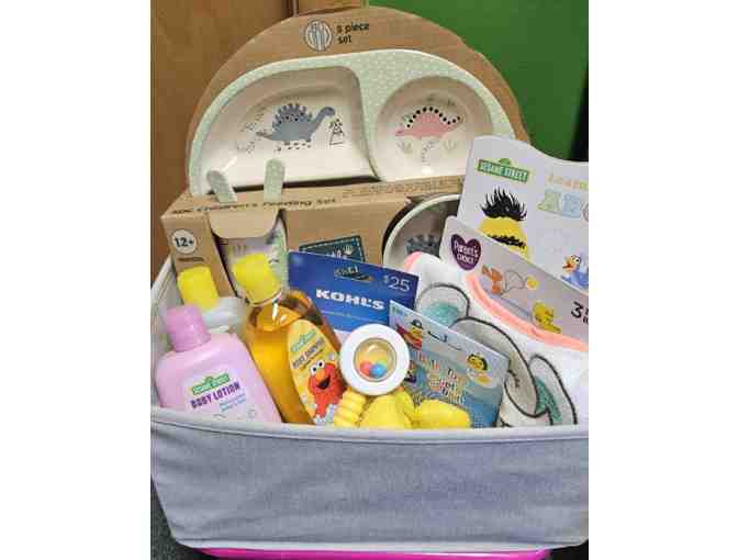 This basket is perfect to welcome your new little bundle of joy. It comes with Sesame Street Bath supplies book and rubber duckies, bibs, a rattle, a 5 piece children's dining set and a $25 gift card to Kohl's.