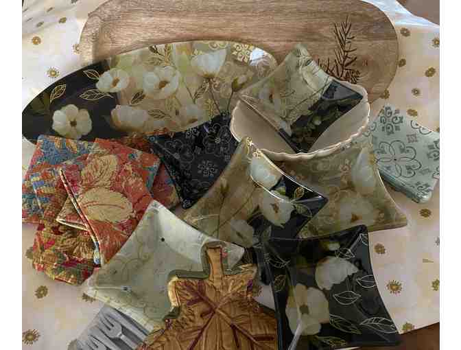 Set your table with 16 small square glass plates/bowls (7 complimentary designs) that accompany a matching oblong glass platter (perfect for savories), a wooden bread platter and gold-trimmed china bowl (ready for a selection of grapes). Basket also includes: 8 April Cornell napkins and pot holder, and a package of 48 plastic mini forks.