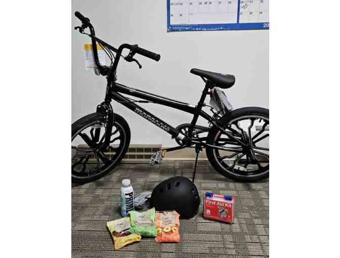 Get your kid moving this summer with a brand new bike! Explore trails or ride around the neighborhood with this Mongoose 20" BMX bike for riders 4'2-5'. A helmet for safety along with a first aid kit and some treats are included in this package.