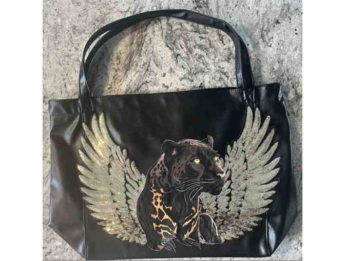 Elegant and spacious black faux leather handbag featuring exquisite gold embroidery with black panther image. Expertly handcrafted with ample compartments and pockets for organization. A true statement piece.