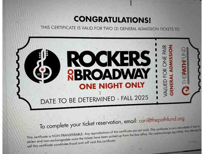Two tickets to Rockers On Broadway, an event that unites Broadway performers and Rock ‘n’ Roll icons to support the work of the PATH Fund, a non-profit organization dedicated to providing resources, training and mentoring to the next generation of performing artists. The PATH Fund is a community of artists, writers, musicians, designers, crew, producers, directors and fans that come together as one to help others.