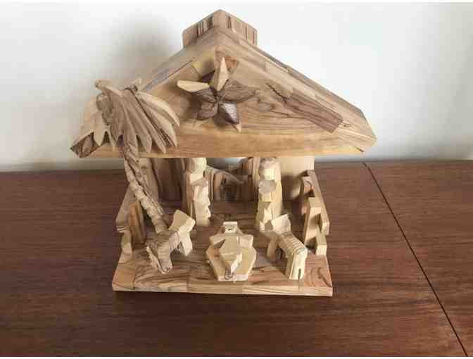 An olive wood nativity playing "Silent Night" was carved near Bethlehem in Beit Sahour. Raja Bannoura and his family hand-carve nativities from pruned olive branches. Since Raja started the workshop in 1974, olive wood nativities, ornaments and carvings have provided hope and harmony as neighbors have worked together creating beautifully carved figures in a community unsettled by civil violence. The music box is hidden in the roof of the stable. Wind the star to hear the melody.