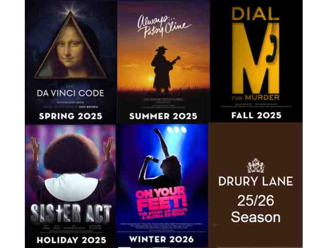 Escape the ordinary! Be moved. Be inspired. Become a part of the story at Drury Lane Theater. Bid on two tickets for the 25/26 season of Drury Lane Theater, in Oak Brook Terrace which features The DaVinci Code, Always... Patsy Cline, Dial M for Murder, Sister Act and On Your Feet.  Read about the 25/26 season here: https://drurylanetheatre.com/2025-2026-theatrical-season/