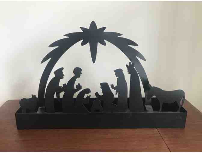 Capture the essence of the Christmas story! The timeless design of this iron candleholder features the Holy Family, the three kings, a sheep and donkey gathered in a stable under the stunning burst of the Star of Bethlehem. Durable and classic, this piece is sure to become a cherished addition to your holiday decor traditions. Crafted by artisans with Noah's Ark in India, an organization that trains artisans to use alternative metals, source recycled materials and create innovative designs grounded in traditional methods.