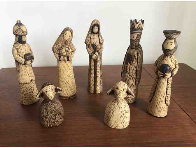 Measures: Joseph with staff: 1.75"W x 6.75"H x 1.5"L, Mary with Jesus: 1.75"W x 6.25"H x 1.5"L, Wisemen with gifts: approximately 1.75"W x 6.25"H to 6.75"H x 1.5"L, Two sheep: 1.75"H x 3.25"W x 1.25"L