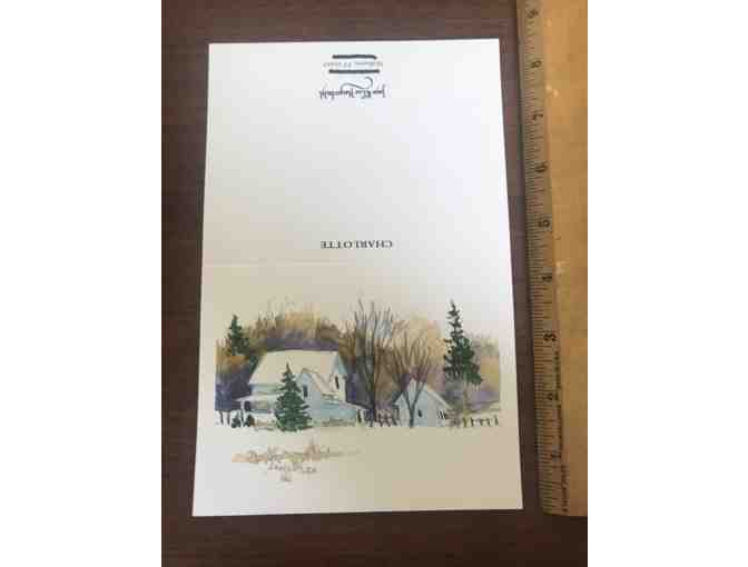 Package of 20 cards of a scene in Charlotte, Vermont. Envelopes included. Cards were crafted and donated by Jane A'Lee Heyerdahl