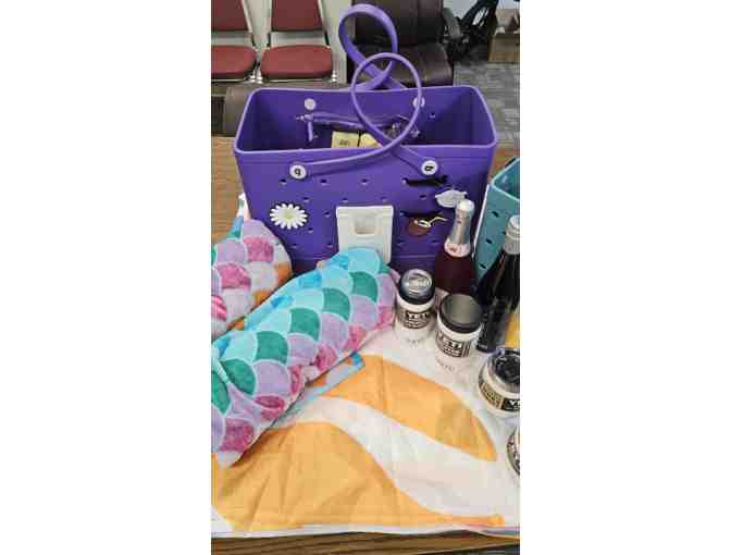 This cute Bogg Bag is the perfect bag for all your trips to the beach or pool. It has a cell phone pocket on the outside plus some cute charms. Inside the bag you will find a large beach blanket, 2 towels, all of your Sun Bum essential care, a Bogg Wine Tote, 2 bottles of wine, 2 Yeti wine tumblers and 2 Yeti can coolers.