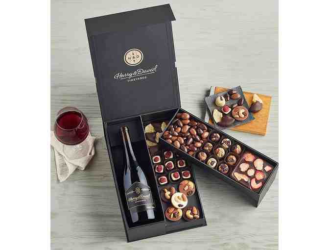Delicious decadence is right at your fingertips with this assortment of artisanal Belgian chocolates. A true taste of luxury, we've included dark chocolate-covered pineapple slices, raspberry caramel truffles, dried fruit and mendiants, dried fruit and nut truffles, chocolate-covered almonds, and dark chocolate strawberry bark. Everything arrives in a bento-style box and is accompanied by a bottle of our Reserve Pinot Noir.