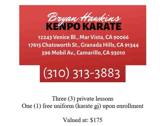 The winner of this auction item is entitled to the following, redeemable at Bryan Hawkins Kenpo Karate: