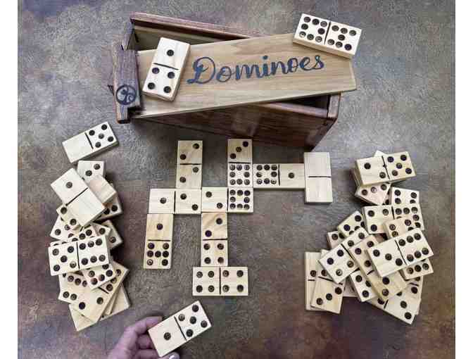 Family game night! Originally created by Mrs. Beckers 1st game 2019 parents. Wood burned Dominoes and parent created storage
