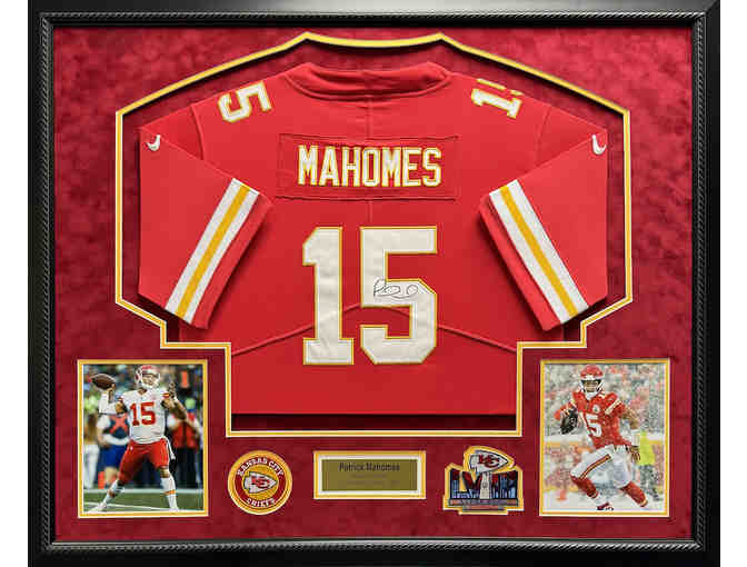 This jersey comes custom designed in a black frame with red suede matting and yellow outline (Chiefs Official Team Colors) – museum quality. Included is (1) Official Kansas City Chiefs Patch, (1) Official Super Bowl LVIII Champions Patch and (2) 8×10 inch photos of Patrick Mahomes. Signed by: Patrick Mahomes