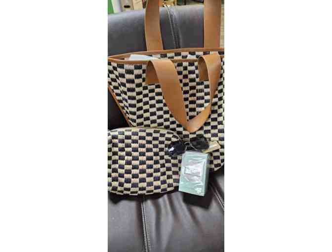 Go out in style with this black checkered large tote bag with leather straps. It includes a small matching zippered pouch, sunglasses and a bottle of Jimmy Choo Floral perfume.