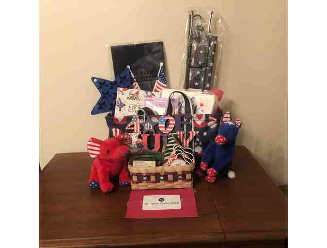 Patriotic Gnome themed tote (13" W x 6 1/2" T x 5 1/2" D) filled with: