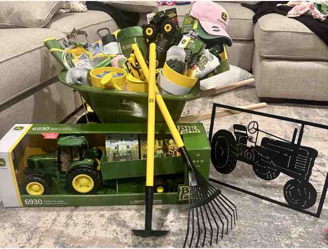 This basket is perfect for the kid who loves tractors. It is a load of John Deere fun. This JD wheelbarrow is full of Tools, work gloves, a blanket, Monster truck, stickers, playing cards, planting soil, 4 pots and packets of seeds, watering can 2 chocolate pow pies, 3 toddler books, 2 JD activity books, crayos, 2 JD kids hats, 2 water bottles, a tractor cookie cutter, JD t-shirts (boys size 4 and 7 and girls size 7), 2 sweatshirts (size 5), Jd 6930 Tractor and Wagon 1/16, and a metal vintage Tractor decor sign.