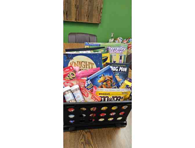 This basket is perfect for a rainy day when all the kids seem to say is "I'm bored". The basket is full of activites to keep them busy. It includes Science kits, books, a movie, art materials, games, baking sets, snacks and a giant umbrella in case they go outside. Donated by Mrs. Benjamin's Kindergarten
