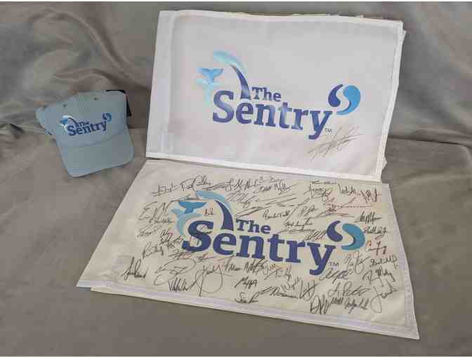- 2024 pin flag signed by the full field of professional players at The Sentry 2024. Framed: 15.5 H x 21.5 W.