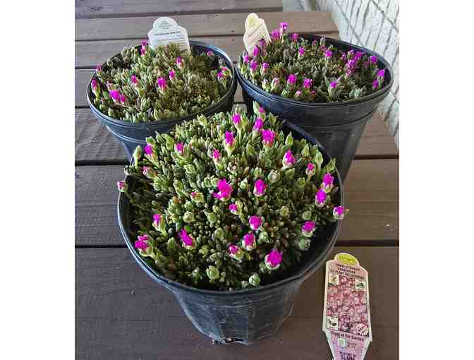 Candystone Ice Plant is a compact evergreen succulent that makes an excellent dense groundcover with fleshy dark green foliage that earns purple tones in winter. Frilly double petaled bright pink daisy like flowers with a yellow eye coat the plant from spring into fall. Needs full sun and dry, sharply-drained soils. Heat and drought tolerant.