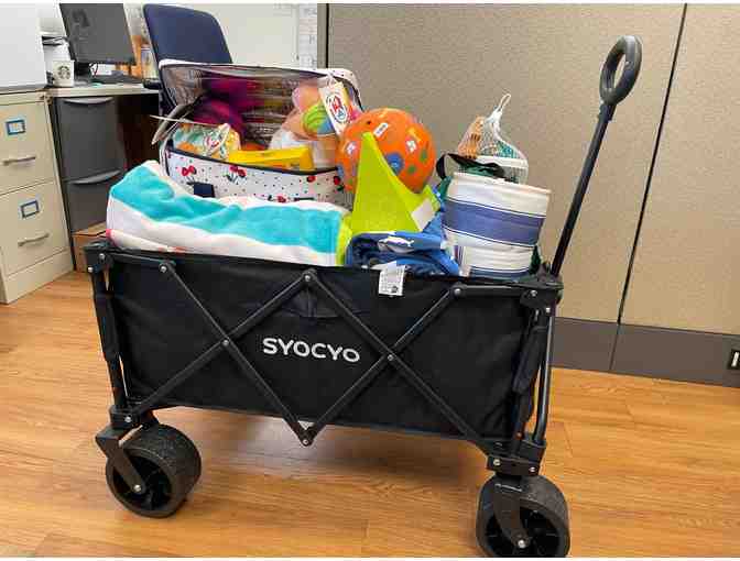 Summer time is coming, so get ready for a fun day at the beach or park with this kit! This beach-ready cart is filled with everything you need for a great day. With beach towels and blankets, a sun shade and cooler, plenty of toys, and a cart to carry it all, there is nothing else you need for a sunny summer day!