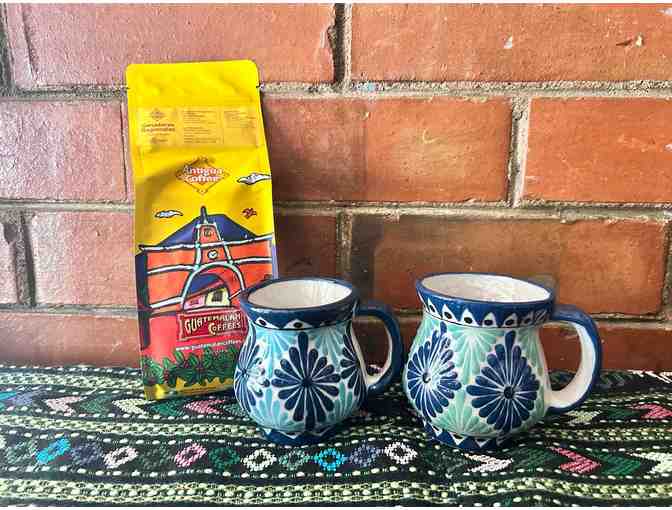 Indulge in a true Guatemalan coffee experience with this exclusive auction set: one pound of premium Antigua coffee, paired with two handcrafted ceramic mugs made by artisans from the Lake Atitlán region.