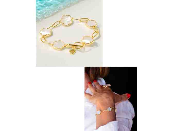 Elevate your style with this Mother-of-Pearl Bracelet, a delicate masterpiece that blends timeless charm with modern sophistication. Crafted in premium 925 sterling silver with a luxurious yellow gold overlay, this bracelet The xudes elegance and exceptional craftsmanship.e design features genuine mother-of-pearl blossoms, each set to perfection to highlight their natural iridescence. The soft, pearlescent glow of the genuine mother-of-pearl reflects light beautifully, evoking a sense of serenity and understated luxury. The blossoms are elegantly linked with gold-plated chain accents, creating a graceful and feminine silhouette that is perfect for any occasion.Secured with a stylish toggle clasp, this bracelet ensures both ease of wear and a secure fit, making it a versatile piece for day-to-night transitions. Whether worn on its own or paired with matching accessories, the Mother-of-Pearl Bracelet adds a touch of natural beauty and sophistication to any look.Perfect as a meaningful gift or as a timeless addition to your own collection, this bracelet is more than an accessory—it’s a celebration of grace, beauty, and the art of fine jewelry. Let its genuine mother-of-pearl blossoms and elegant design brighten your style with every wear.