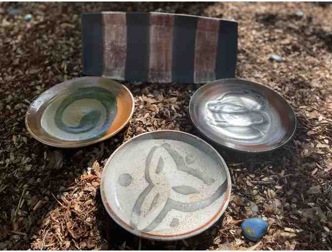 Elevate your table with this elegant set of three hand-thrown 12” stoneware serving platters and one rectangular serving tray, each a unique expression of craftsmanship and form. Sourced from the renowned Glen Echo Holiday Sale, these pieces reflect the beauty and utility of fine ceramic art. This set is perfect for entertaining or display, bringing both functionality and handmade charm to your home.