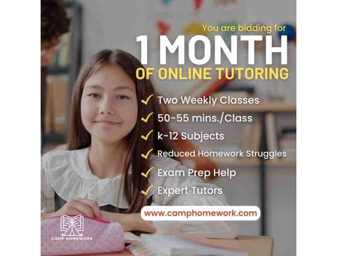 This one-month tutoring package includes eight online tutoring sessions. You may find out more about us at CampHomework.com. Part of our commitment is giving back to the communities we serve. By bidding on this certificate, you will not only help your child be more successful in school and help this organization, but you will also help a child in the Philippines or India go to school. We use part of our profits to sponsor children from impoverished communities in the Philippines and India to allow them to get an education.