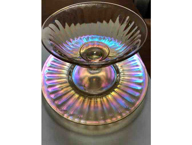 Marigold iridescent carnival glass. Clear glass foot and stem with an iridescent