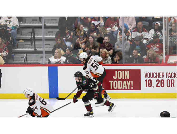 Four tickets to a Tucson Roadrunners 2025-2026 Regular Season Home Game. Includes a hat, folder, postcard, sticker, and notepad.