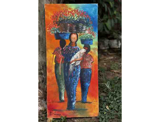 This original oil on canvas artwork captures a timeless Guatemalan scene: three women in traditional clothing walking home after a market day, carrying their goods with grace and strength. Rich in color and cultural detail, this piece reflects the beauty of everyday life in Guatemala.