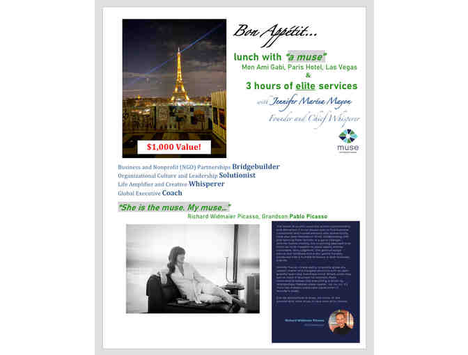 Bon Appétit! A multi-course lunch at Mon Ami Gabi (Paris Hotel, Las Vegas) with “a muse” plus an additional 3 hours of elite business services with Jennifer Mayon, Founder and Chief Whisperer, Muse International. muse-intl.com | @muse_intl