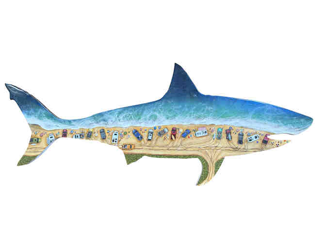 "Sydney is a Chatham native who currently resides in Boston. Each summer, she seeks to capture fond memories of growing up on the Cape where her family still resides. This year's shark features an aerial view of Outer Beach. It is made with acrylic paint, epoxy resin, and real sand collected from Outer Beach that can be seen along the shoreline if you look closely. She paints a limited number of commissions as a reprieve from long days working her day job in the emergency room at Boston Children's Hospital. Reach out or learn more on her website, sydneywhitcombart.com."
