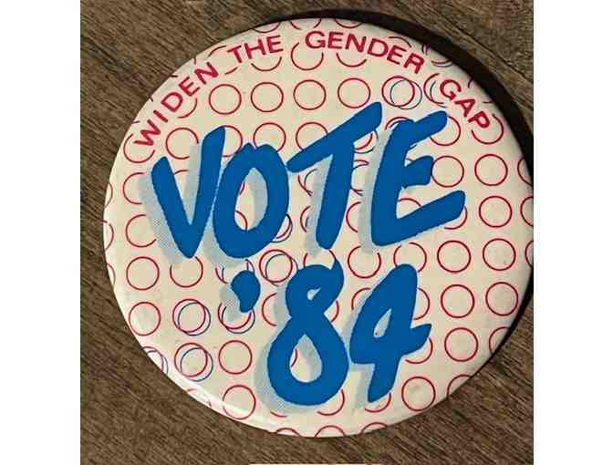 This button from 1984 was designed to call attention to the gender gap. The button was used to demonstrate the fact that Geraldine Ferraro was the first woman nominated to be nominated by a major political party to run for Vice President