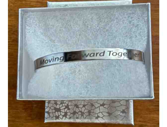 On the outside of this 1/4" slim cuff bracelet is engraved Moving Forward Together! and inside is the National Women's History Alliance.org.