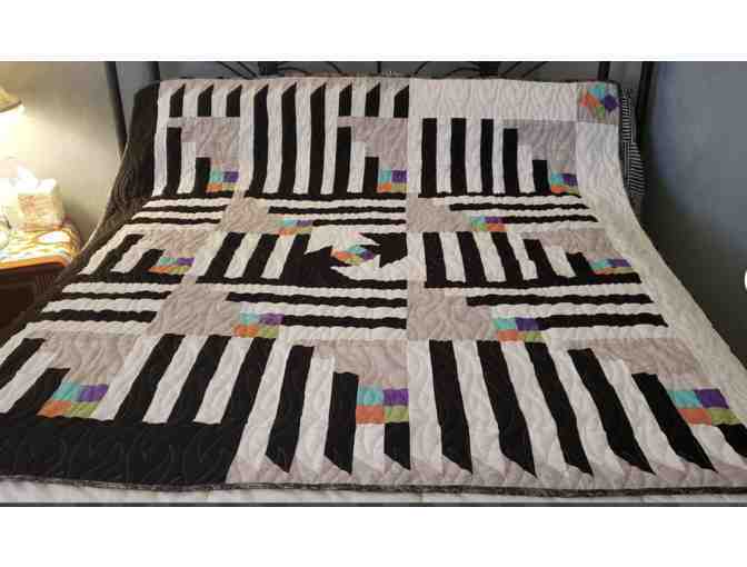 This gorgeous 'Venetian Blinds' quilt is elegant. With its black and white patterns and just a touch of color, this quilted piece is versatile and can be used in many ways.